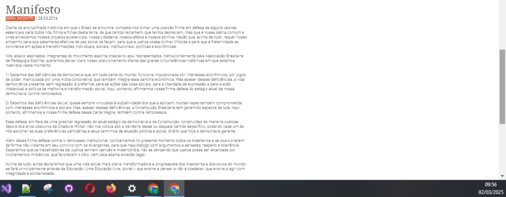 Nesta republicação, resgatamos o “Manifesto Espíritas em defesa da Democracia”, publicado pela Associação Brasileira de Pedagogia Espírita por Dora Incontri, datado de 28 de março de 2016, com o intuito de preservar um importante registro histórico. Esclarecemos que a divulgação deste documento se dá exclusivamente por seu valor histórico e cultural, sem que isso signifique um endosso ou a assunção de responsabilidade pelos sentimentos e opiniões nele contidos. Nosso objetivo é fomentar a reflexão crítica sobre o contexto político, social e educacional da época, permitindo que o debate se desenvolva com base em uma compreensão mais ampla dos desafios e anseios daquele período. Em março de 2016, o Brasil atravessava um período de intensa turbulência política e econômica, inserido na era da Nova República, consolidada após o fim da Ditadura Militar. Naquele momento, o país vivia um processo de impeachment contra a presidente Dilma Rousseff, cenário que ampliou a polarização política e despertou debates profundos sobre a qualidade da democracia, a integridade das instituições e os rumos para a retomada do crescimento econômico. Esse ambiente de incerteza e transformação foi marcado por tensões entre diferentes setores da sociedade.O Espiritismo, conforme os ensinamentos de Allan Kardec, tem um campo próprio de atuação, voltado à moral, ao progresso espiritual e à fraternidade, sem constituir um sistema particular de política, legislação ou economia social. No entanto, alguns grupos e indivíduos, em meio às circunstâncias daquele momento histórico, optaram por se posicionar politicamente. Essa escolha, ainda que legítima do ponto de vista individual, não representa a doutrina espírita, que, conforme orientações do próprio Kardec, deve manter-se distante de disputas políticas e de temas que possam gerar divisões entre seus adeptos.